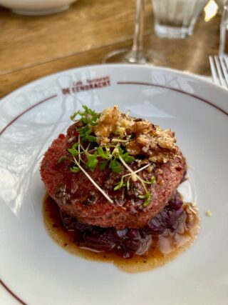 Voor de Amusetour hebben ze vandaag de prachtige serre gereserveerd, met uitzicht op het Victoriepark. Eerst ontvangen we een glas wijn, Syrah/Grenache, gevolgd door een goede portie rilette van kalfswang op rode kool en afgetopt met een crunch van walnoot.