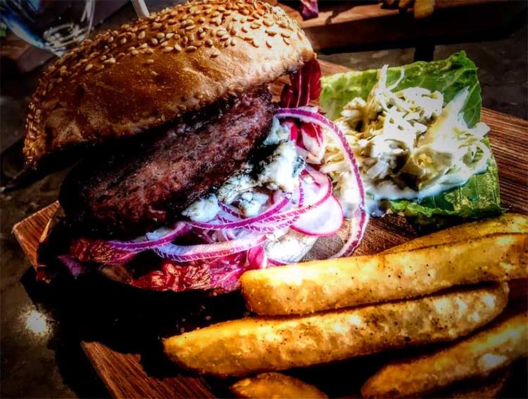 Op een robuuste houten plank lag daar de tweede helft van Burgers ’n Beer. De hamburger, een mooi torentje van brood, radicchio, radijsjes, rode ui, blue stilton en perencompote. Een heerlijke combinatie waarbij de smaak van de Saison erg goed aansluit bij de hamburger of ze zelfs versterkt.