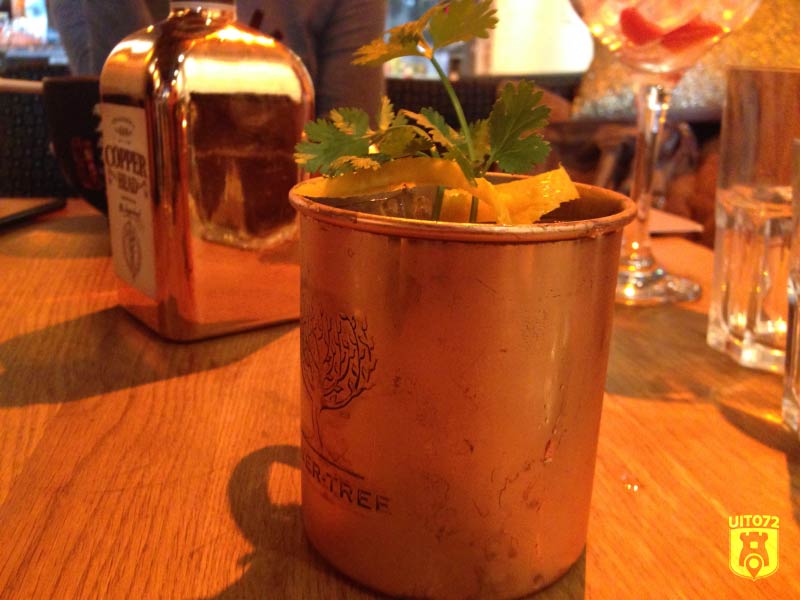 Een perfecte serve, met koriander en sinaasappelschil. Dit is een premium gin, en dat proef je in die zin dat hij behoorlijk zacht is. Vooral als je de gin puur drinkt merk je dat verschil enorm. Deze Gin Tonic wordt geserveerd in een Moscow Mule beker van koper.