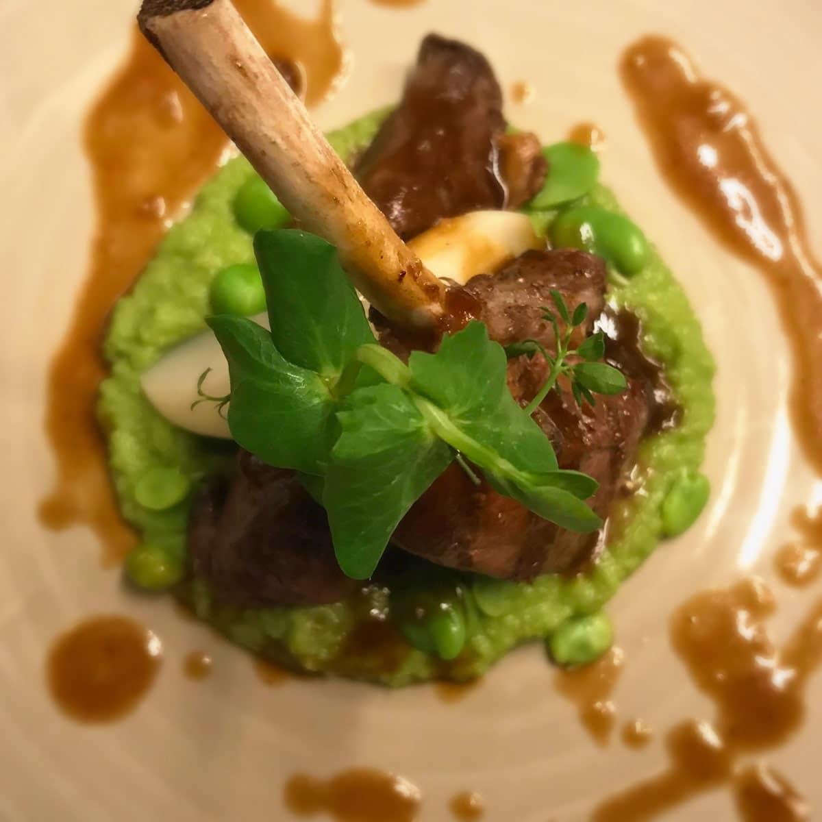 Op het bord verschijnt lamsrack op een felgroene crème van doperwten en wasabi. Het oogt prachtig en straalt aan alle kanten lente uit. De wasabi verbindt dit gerecht met de eerdere gerechtjes, zonder overheersend te worden. De geglaceerde voorjaarsgroente was een tikje hard, maar dat werd meer dan goedgemaakt door het boterzachte lam.