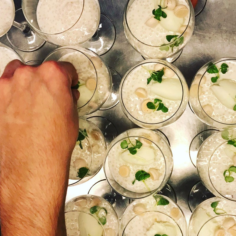 De beschrijving klinkt al spannend: Tapioca pudding met limoenijs, tropisch fruit ganache, roodfruit meringue. En het resultaat is ook spannend! Denk aan rijstepap, maar dan met korreltjes (de tapioca, gemaakt van cassavewortel) en aangevuld met frisse smaken van passievrucht en limoen, met kleine krokante schuimpjes. Apart, maar lekker!