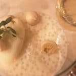 De beschrijving klinkt al spannend: Tapioca pudding met limoenijs, tropisch fruit ganache, roodfruit meringue. En het resultaat is ook spannend! Denk aan rijstepap, maar dan met korreltjes (de tapioca, gemaakt van cassavewortel) en aangevuld met frisse smaken van passievrucht en limoen, met kleine krokante schuimpjes. Apart, maar lekker!