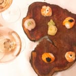 Wijnglazen worden bijgevuld en het volgende gerechtje verschijnt aan tafel: tataki zalm met rettich en uien vinaigrette.