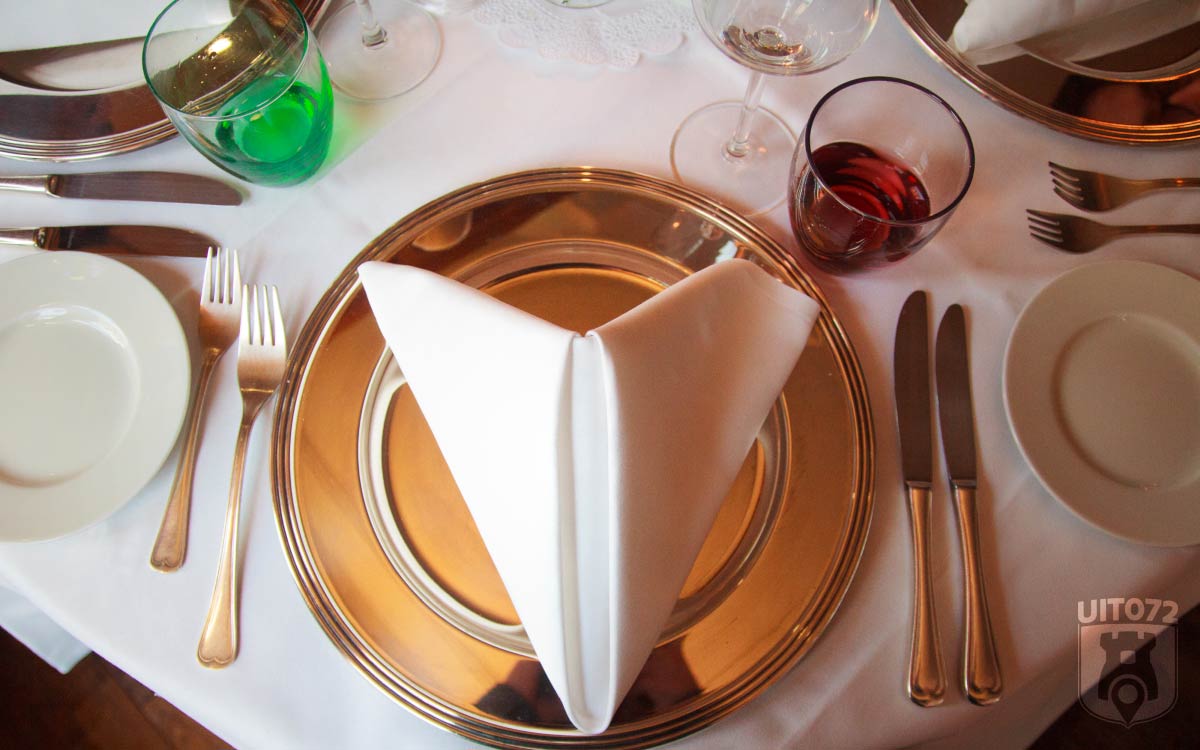 Roberto brengt ons naar een mooi gedekte ronde tafel bij het raam, alwaar hij ons een heerlijke prosecco schenkt. Niet lang daarna volgt de amuse, Polpette, een Italiaanse gehaktbal in een kruidige tomatensaus. Voor onze vegetarische Noukka is er een bruschetta met basilicum, tomaat en knoflook.