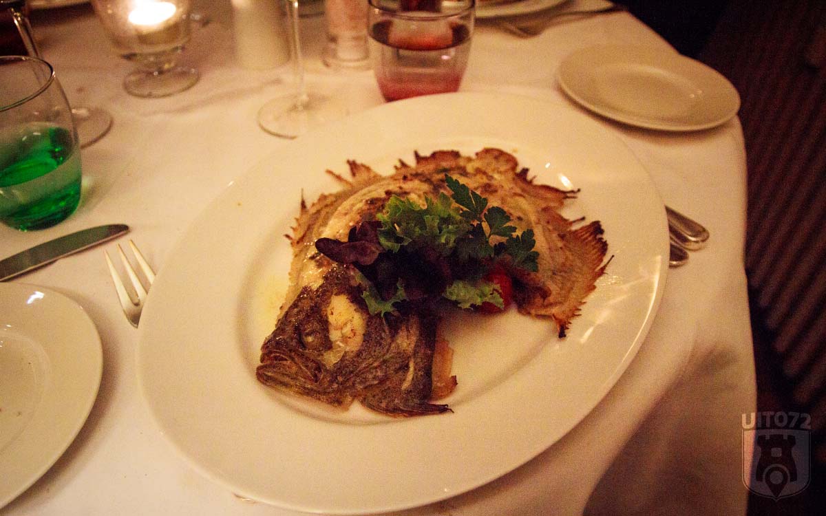 Onze vega chick gaat voor de tarbot, die vakkundig door de ober van zijn graten wordt ontleed. De tarbot is gemarineerd in melk, citroen en peterselie. Noukka zegt niets tijdens het eten, dat betekent altijd dat het zeer goed smaakt.