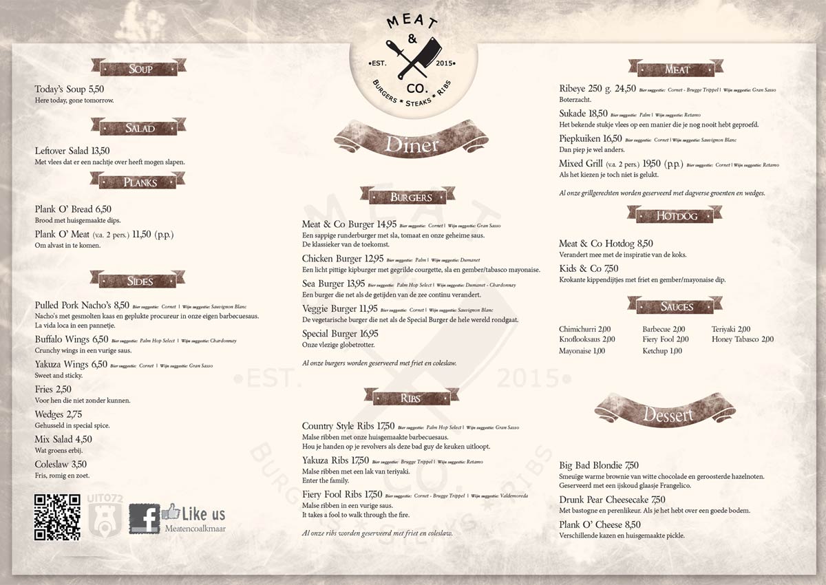 Een blik op de kaart laat zien dat er ook een paar gerechten zonder vlees zijn, zoals bijvoorbeeld de visburger. Het restaurant heet immers Meat & Co. Op de kaart staan de drankjes die het beste bij je gerecht passen. De best bijpassende wijn maar ook het best bijpassende bier! Dat laatste is in nauwe samenwerking met Bierwinkel Alkmaar dus dat zit helemaal goed.