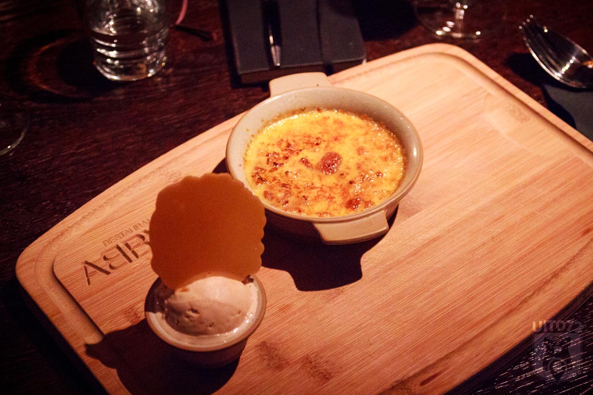 De ribeye is zo zacht als boter en de smaak van de grill heeft tot in de sappen van het vlees weten door te dringen. De jus van kalf en eekhoorntjesbrood zorgt voor een zoete aardse toon en werkt erg goed bij de geroosterde pompoen. De jus wordt voordat hij het bord raakt opgevangen door wat Roseval aardappeltjes waarop de ribeye wordt geserveerd.