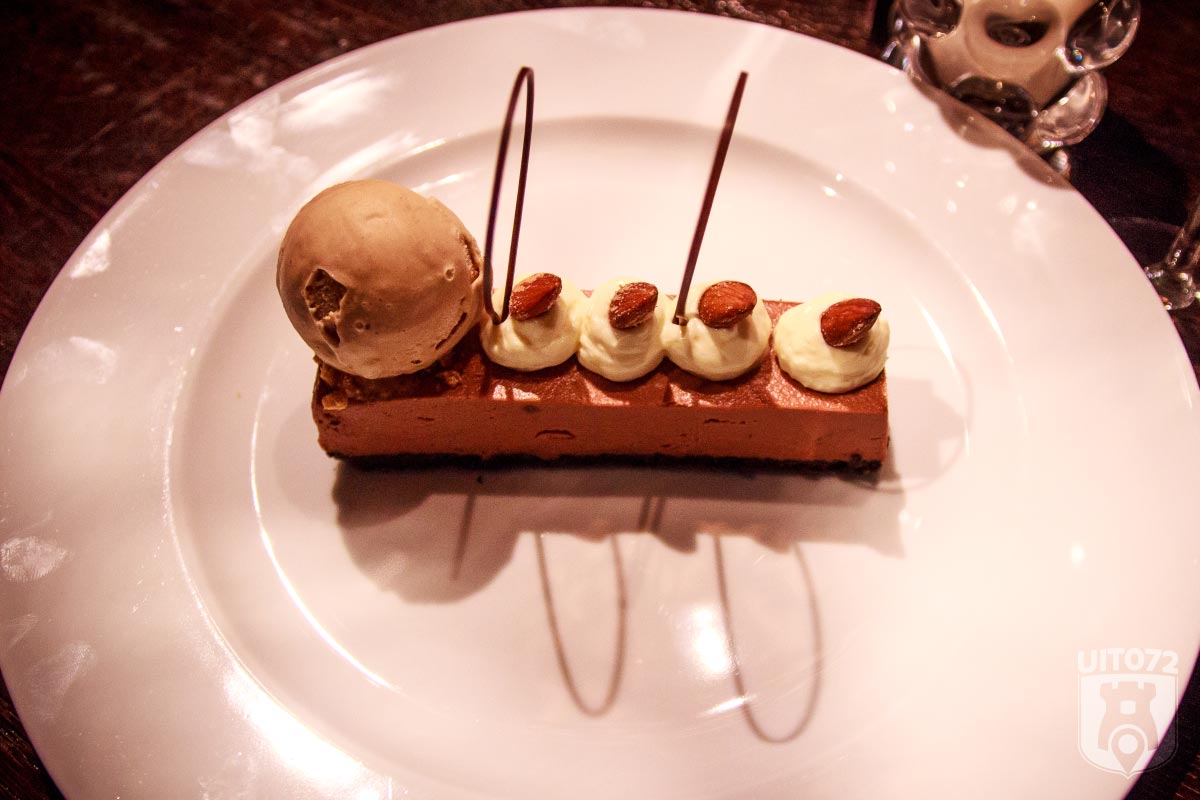 Als kroon op deze al heerlijke avond ben ik gegaan voor de chocolade soufflé met witte Toblerone, salted caramel en bananenijs en heb ik een nieuwe begeleider in dienst genomen: een glas Moscatel van het druivenras Xéres uit Andalusië.