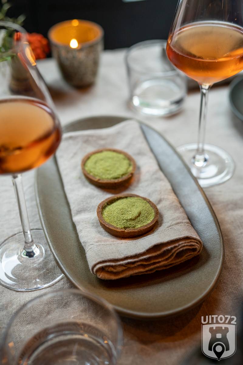 Bij binnenkomst worden we vriendelijk onthaald. Nadat de jassen worden opgehangen en we plaatsnemen aan een mooi tafeltje, volgt de eerste lastige keuze: wat willen we als aperitief? De Cider van Dassemus uit Chaam slaan we vriendelijk af, net als de spannende waterkefir met gele biet, rabarber en vlier. De Zwirs Parelwijn Rosé van vlakbij (Oterleek) prikkelde onze nieuwsgierigheid nog net iets meer!