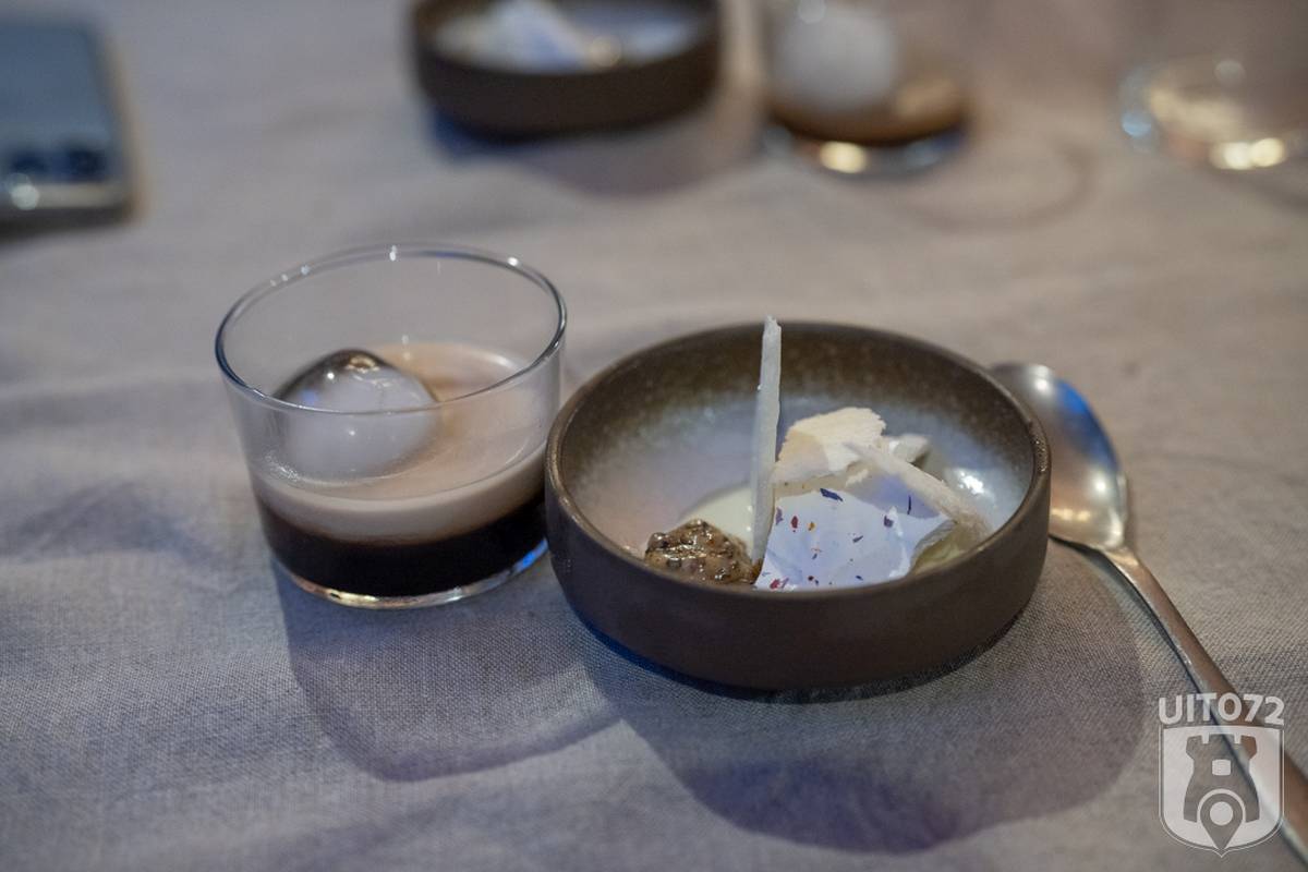 Ook het dessert is een bijzondere combinatie. Van een jong witschimmelkaasje van boerderij Köning uit Zevenaar (Gelderland) is ijs gemaakt. Geserveerd samen met hangop met vers gemaaid gras, krokant melkschuim, merengue met weidebloemen en bijna-verbrande room.