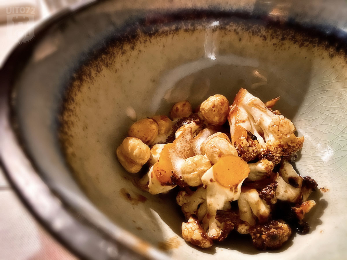 Het tussengerechtje herkennen we nog van vorig jaar: een combi van gegrilde bloemkool, hazelnoot, miso en soja. Leuk om te melden dat zelfs de sojasaus van Hollandse bodem komt. Tomasu is een unieke sojasaus die gebrouwen wordt in de enige sojasaus microbrouwerij van Europa. Gewoon, in Rotterdam.