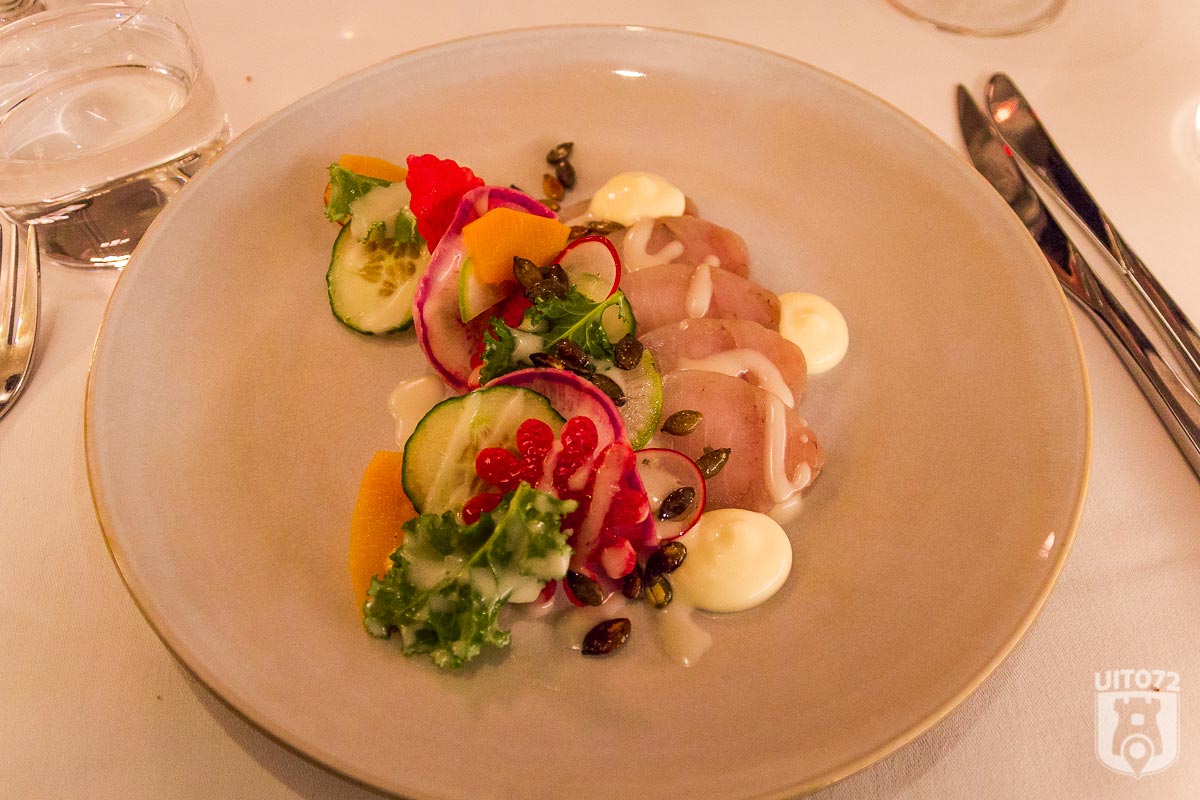 Het garnituur van gepofte pompoen en zoetzure pompoen, radijs, een gel van duindoorn met om het af te maken een champagnedressing is naast dat het bijzonder goed smaakt een waar kunstwerk op je bord. De eerste gang heeft onze uiteraard hoge verwachtingen volledig waargemaakt!