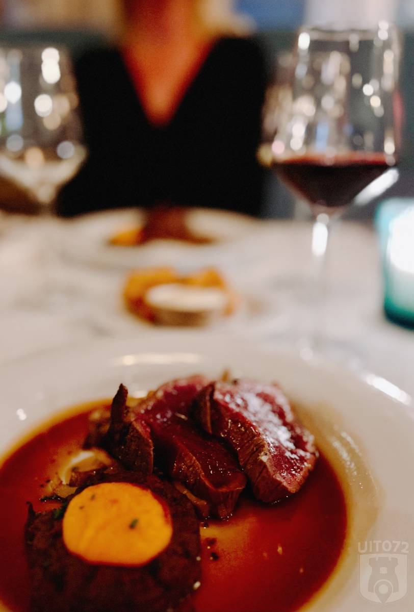 Het hert van de Veluw is boterzacht en komt met een heerlijke jus, pompoencrème en top dikke frieten (Pommes Pont Neuf). Erbij gaan we voor een rode blend van Petit Castel, uit Israël. Genieten!