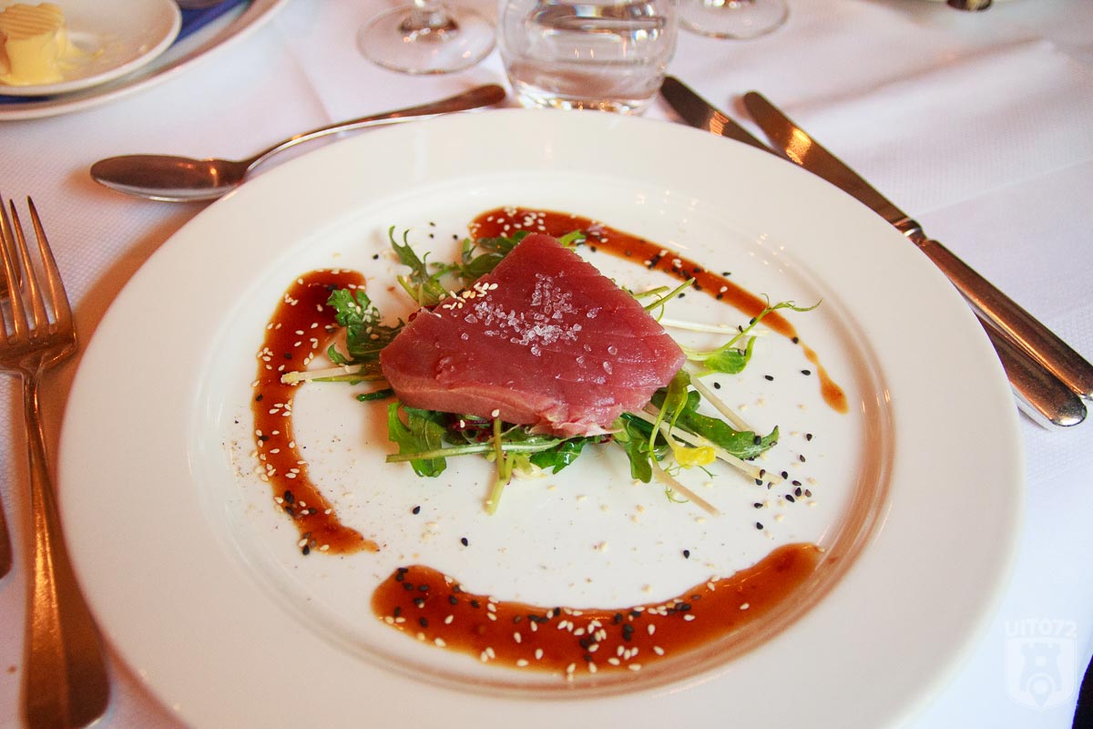 We beginnen met de eerste gang: een gerookt stuk yellowfin tonijn met een dressing van soja en sesam, begeleid door een prima Grüner Veltliner. Yellowfin tonijn is trouwens culinair wel verantwoord, het is de bluefin die op dit moment in zwaar water verkeerd. Na deze disclaimer even gezegd hebbende voor de duidelijkheid, wow, wat een zacht stukje vis en wat een goede voorbode voor wat er nog op ons culinaire pad te wachten staat.
