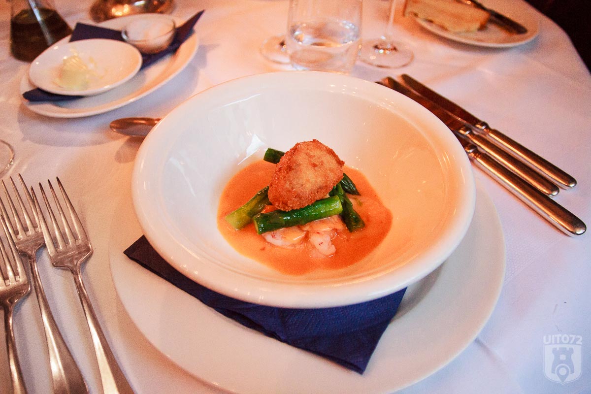 Een krokant gebakken kalfszwezerik met langoustinestaartjes in een saus van kreeft. Fantastisch! Een bijzondere combinatie van smaak, met daarnaast een stevig vette Meursault om alles in goede banen te leiden.