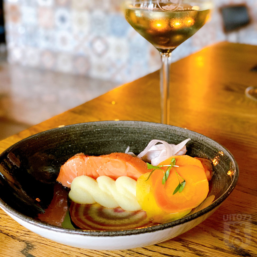 De gekonfijte zalm is boterzacht en vooral smaakvol samen met de escabeche van groenten. Het kleurrijke bord wordt afgemaakt met crème van pastinaak en ghoa cress.