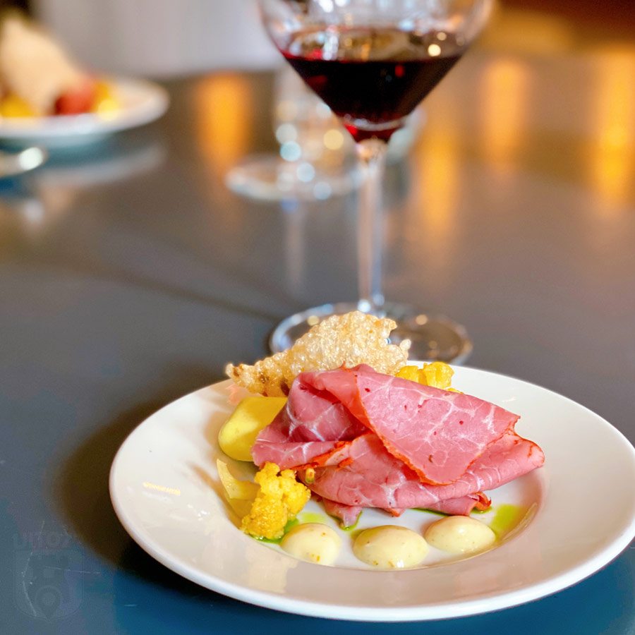 Op het menu een kruidige runderpastrami met mousse van piccalilly, kroepoek van pinda, bloemkool en curry mayonaise. De koude Beaujolais Villages houdt goed stand. De prima start smaakt naar meer!