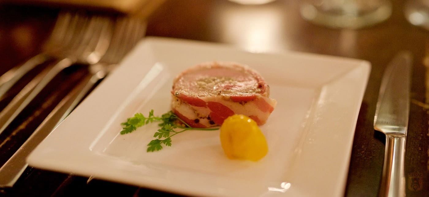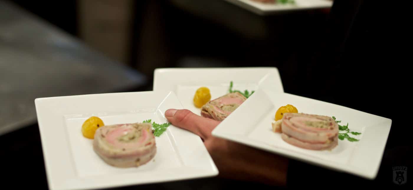 De amuse kwam op tafel en het feest kon beginnen. Het was een Rouleau van fazant met pancetta en dat zag er geweldig uit. Zo smaakte het trouwens ook. Een goed begin, met nog even een kleine shoutout naar de prosecco die erbij werd geschonken.