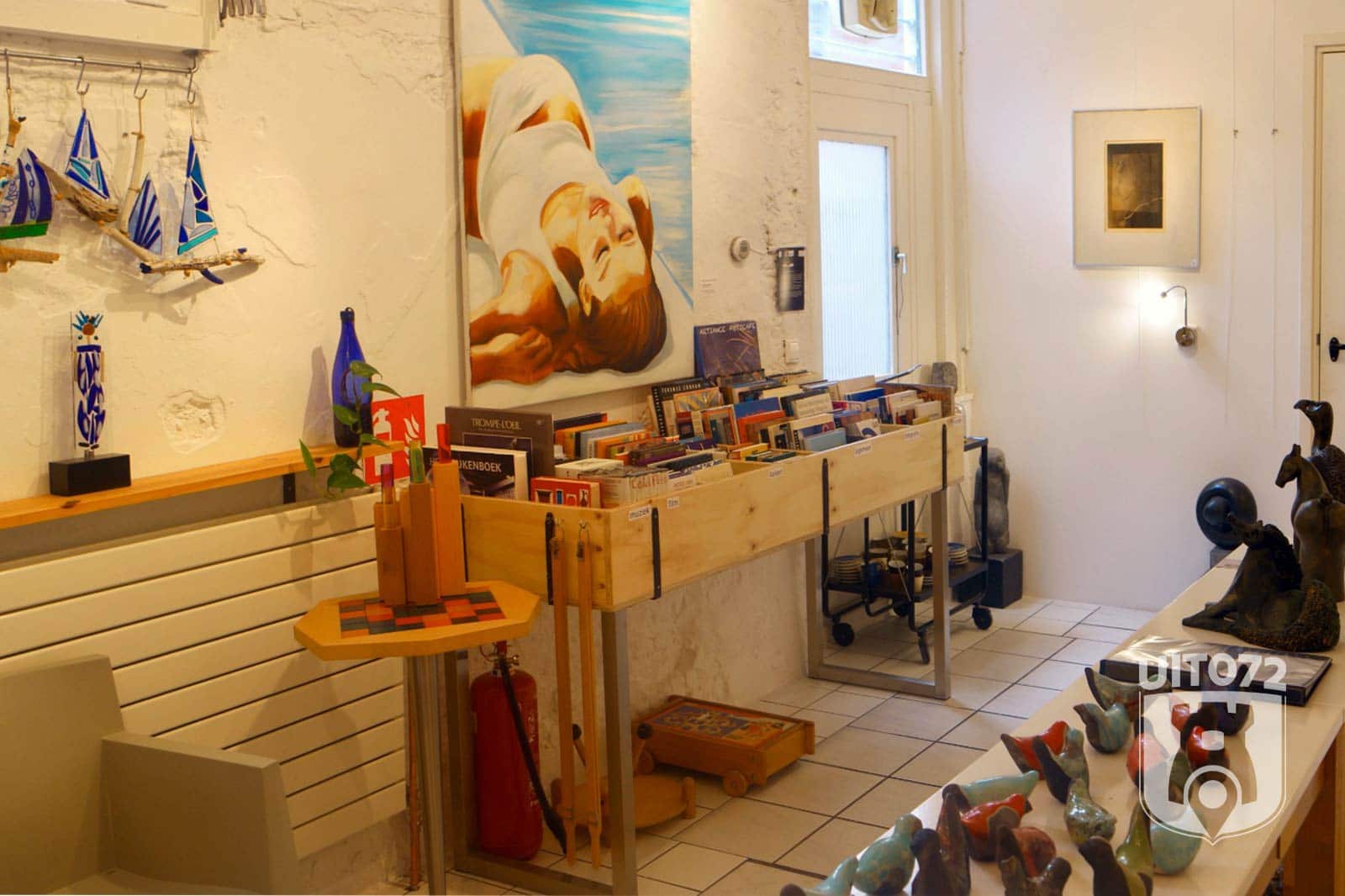 Voorin de winkel wordt mooi, tweedehands design verkocht. Daarnaast hebben ze een fraaie collectie van zowel tweedehands lederen tassen als kwalitatief goed, duurzaam speelgoed. Achterin de winkel is een verkoop expositie van werk van lokale kunstenaars. We vinden er fantastische werken variërend van foto’s tot beeldhouwkunst. Geen heel grote objecten, want het moet wel betaalbaar blijven. En het moet makkelijk mee kunnen gedurende de rest van de dag in de stad.