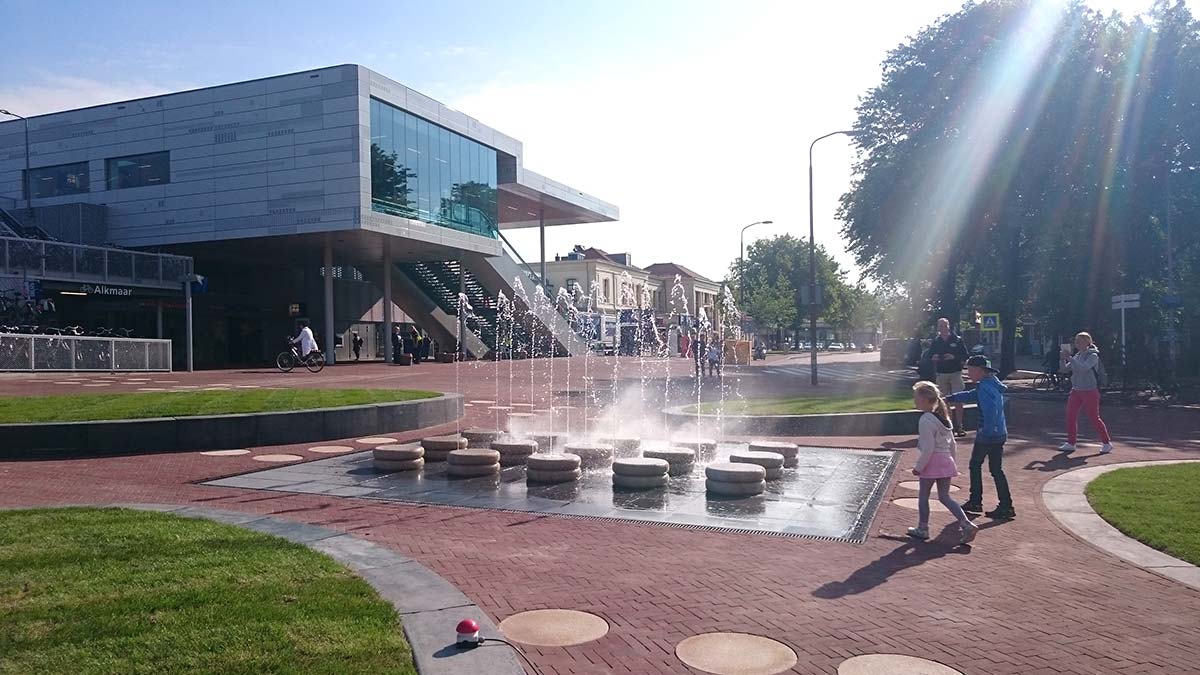 Vandaag is de kaasfontein op het voorplein van het station Alkmaar feestelijk geopend. Wethouders Jan Nagengast (CDA) en Victor Kloos (OPA) drukten samen met Eelco Kooistra van Rots Maatwerk op de knop om het waterelement aan te zetten.
